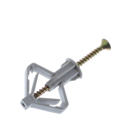Дюбель вставляется также в заранее приготовленное отверстие, а затем забивается гвоздем при помощи молотка. Изделие получило название бабочка, поскольку имеет свойство при закручивании раскрываться в свободном пространстве и с обратной стороны упираться в поверхность крылышками. Принято оборудовать особыми манжетами, которые смогут препятствовать его прокручиванию. Самыми распространенными, применяемыми в строительстве, являются изделия размером 9*13 мм и 10*50 мм. Во время приобретения они предлагаются в сложенном виде. Для полноценного раскрытия потребуется саморез, имеющий длину не более 55 мм.