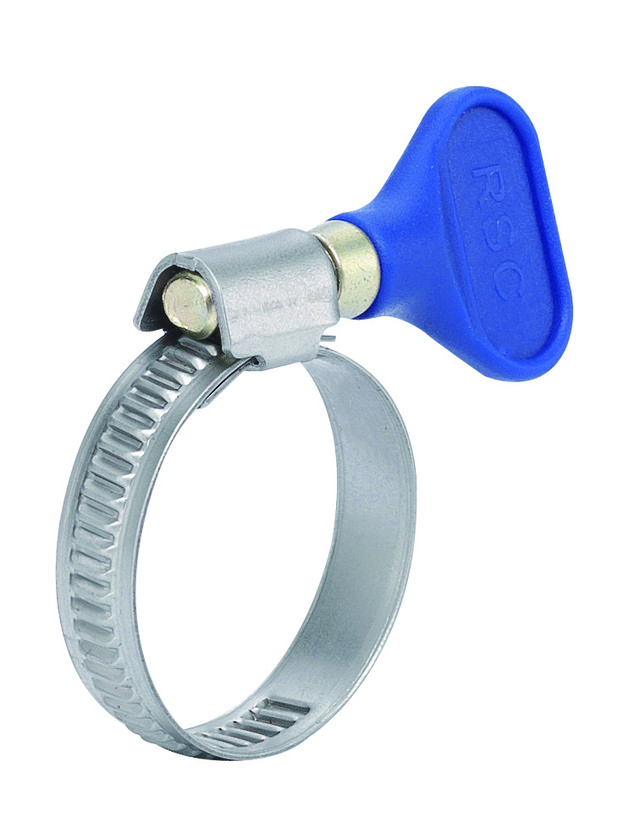 Конструкция:состоит из металлической ленты с червячным механизмом и пластикового винта-бабочки. Лента имеет перфорацию для зацепления с винтом, что обеспечивает надежную фиксацию. Винт-бабочка позволяет закручивать хомут вручную без использования инструментов.